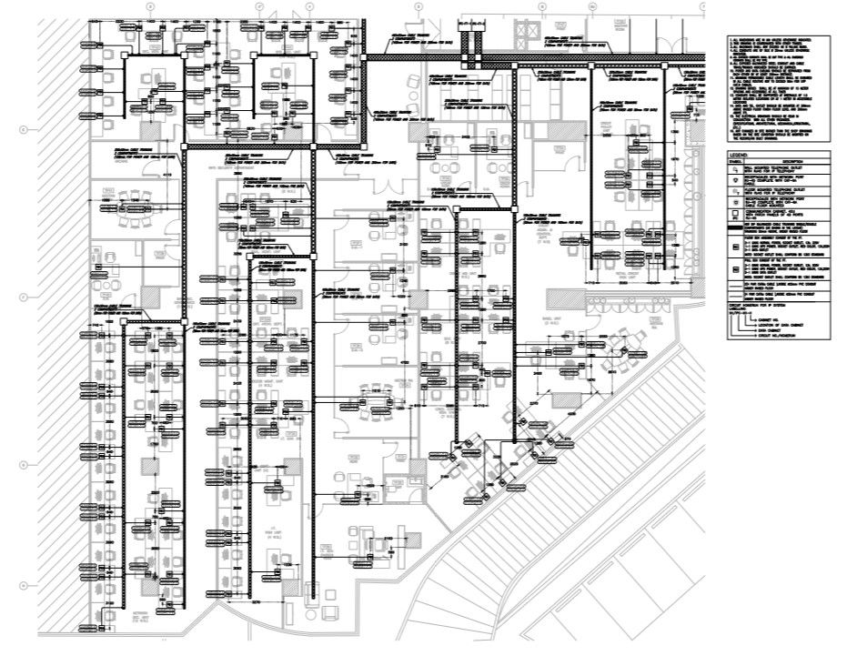 Office building plan detail with IP system layout. This layout includes all information and detail related IP system in the office building. it showed with measurements, levels, connections and its symbol description.