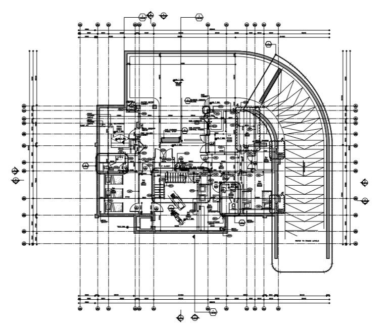Detail of basement floor plan of a building. This working drawing includes all dimensions, levels, section line, centre line. Also include ramp or slop detail, all area planning and its labelling detail like HVAC wall, system control panel, closet, gas cabinet and furniture detail.