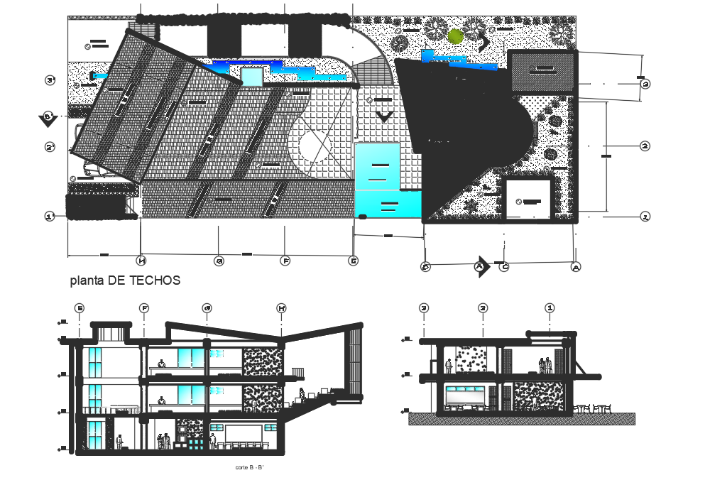 Landscaping layout plan and section detail dwg file, with dimension detail, centre line plan detail, landscaping detail with plant and tree detail, reeling detail, etc.