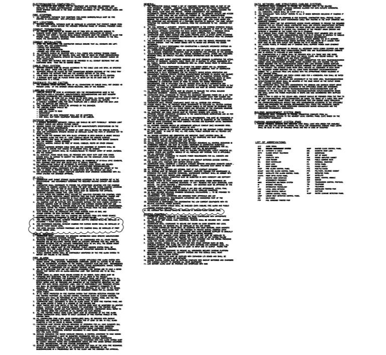 Low current systems-note and abbreviations detail. Detail description of electromagnetic compatibility, fire stopping, wet locations, conduit installation, cable tray system, raceways filling factors, outdoor network and other.
