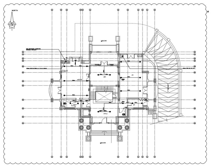 Ground floor plan with fire protection system . drawing with the fire protection system symbols and abbreviations .detail plan with dimensions , levels and other detail.