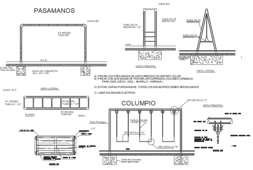 Garden game zone detail dwg file, with swing detail, railing detail, main elevation detail, side elevation detail, etc.
