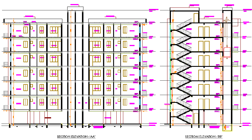 Apartment flat section elevation detail dwg file, with section elevation A-A’ detail and section elevation B-B’ detail, naming detail, dimension detail, leveling detail, etc.