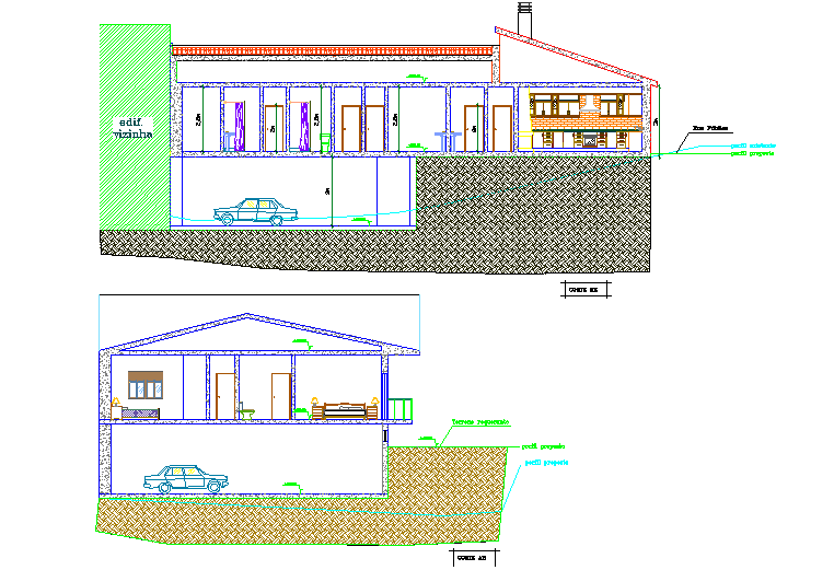 Detail of house section dwg file, including basement car parking detail, naming detail, dimension detail, balcony detail, etc.