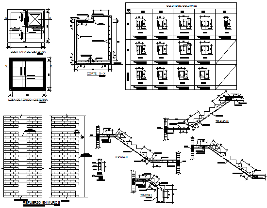 Column and stair section detail dwg file, including dimension detail, bolt nut detail, reinforcement detail, brick wall elevation detail, etc.