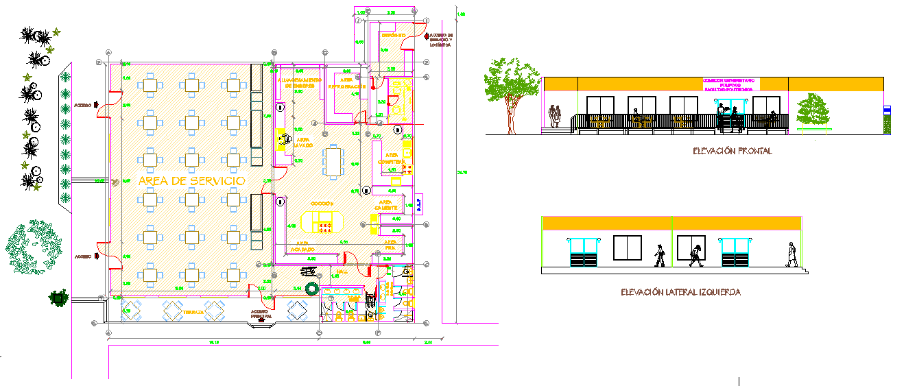 The file additionally provides front elevation and left elevation views showing façade detailing, window positions, signage zone and structural alignment. Each elevation highlights human scale reference and building height proportions for construction clarity. This restaurant design DWG is ideal for architects, civil engineers, interior designers and builders who need professional layout guidance for dining spaces. The detailed furniture distribution and service zoning make this drawing suitable for project planning, municipal approvals and interior execution stages.