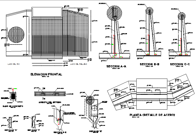 Foundation bridge detail dwg file, front elevation detail, section A-A’ detail, section B-B’ detail, section C-C’ detail, naming detail, naming detail, etc.