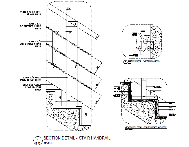 Section stair hand rail detail dwg file, including tred and riser dimension detail, naming detail, concert mortar detail, etc.