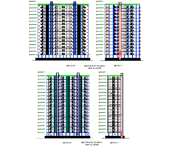 3 BHK tower B and 2 BHK tower C apartment flat detail dwg file, with section X and section Y detail, leveling detail, naming detail, etc.