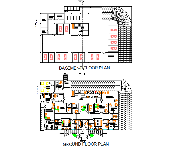 Basement floor and ground floor hospital plan detail dwg file, car parking detail, ramp detail, stair detail, section line detail, etc.