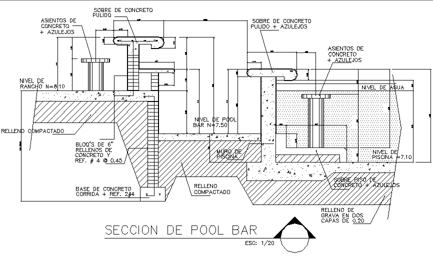 Pool bar section detail dwg file, with naming detail, dimension detail, reinforcement detail, scale 1:20 detail, etc.