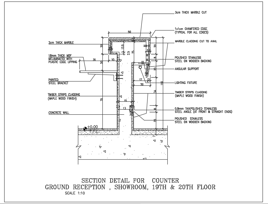 Reception-Countersection Details Dwg file. Furniture detailing section detail, naming detail, dimension detail, glass detail, etc in autocat format.