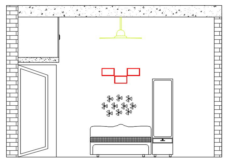 Interior view of room. sectional elevation of room showing interior view of bedroom. including detail of t.v cabinet and tv unit