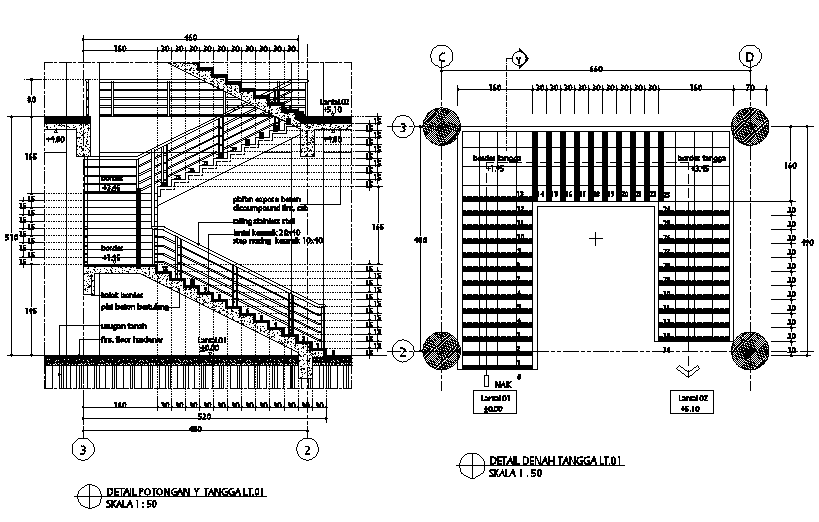 Concert stair plan and section detail dwg file, including lending detail, dimension detail, naming detail, reeling detail, etc.
