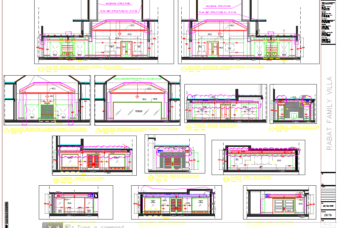 This family interior design DWG file provides a complete set of architectural interior drawings created in AutoCAD, showing detailed elevation views for the master bedroom, lounge, dining areas, and games room. Each elevation includes measured wall lines, door and window sizes, ceiling height reference, and interior partition alignment. Furniture layouts for beds, wardrobes, dining tables, sofas, and storage units are drafted to scale, helping users visualize the correct proportions inside every space. The uploaded drawings also show lighting points, decorative ceiling patterns, joinery details, and cabinetry sections that support high-quality interior execution.