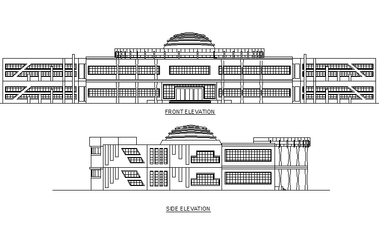 Front elevation and side elevation school detail dwg file, including furniture detail with door and window detail, main gate detail, etc.