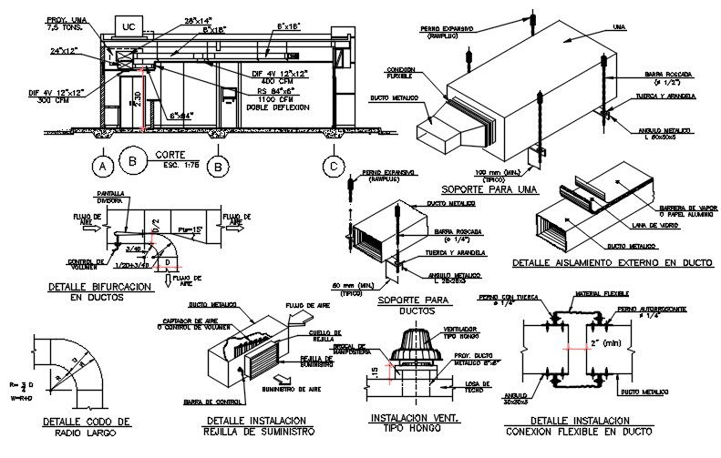 Airconditioning installation and support detail. specification detail with isometric view, plan, sections and installation detail of vent and other equipment with dimensions and labeling.