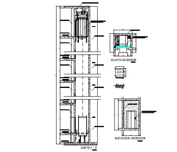 Elevator detail. Detail of elevator with description, plan, elevation and section view with detail and dimensions.