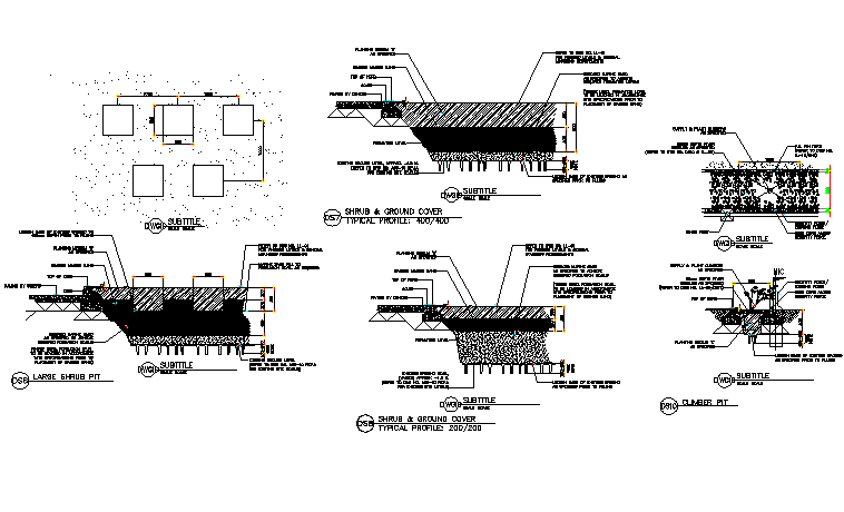 Plant and tree detail dwg file, with section detail, naming detail, dimension detail, concret mortar detail, soil detail, etc.