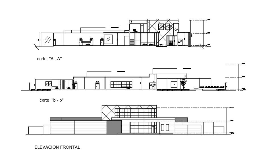 Hospital Building Section Elevation In DWG File which shows the section details, elevation, door, balcony, lawn area.