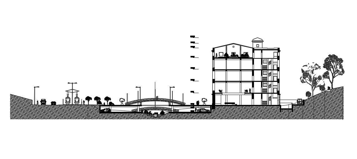 Street Section In DWG File which shows the details of buiding section, parking area, lawn area.