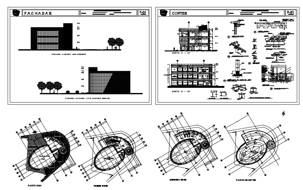 Building Plan In DWG File which includes wall construction, section details, beam and column elevation, doors and window layout, roof plan, staircase view, landscape area.