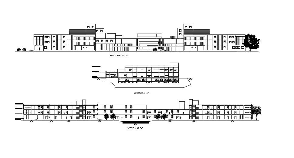 Hospital Building Plan Section Elevation In DWG File which shows the section details, elevation details, furniture details, door and window design.