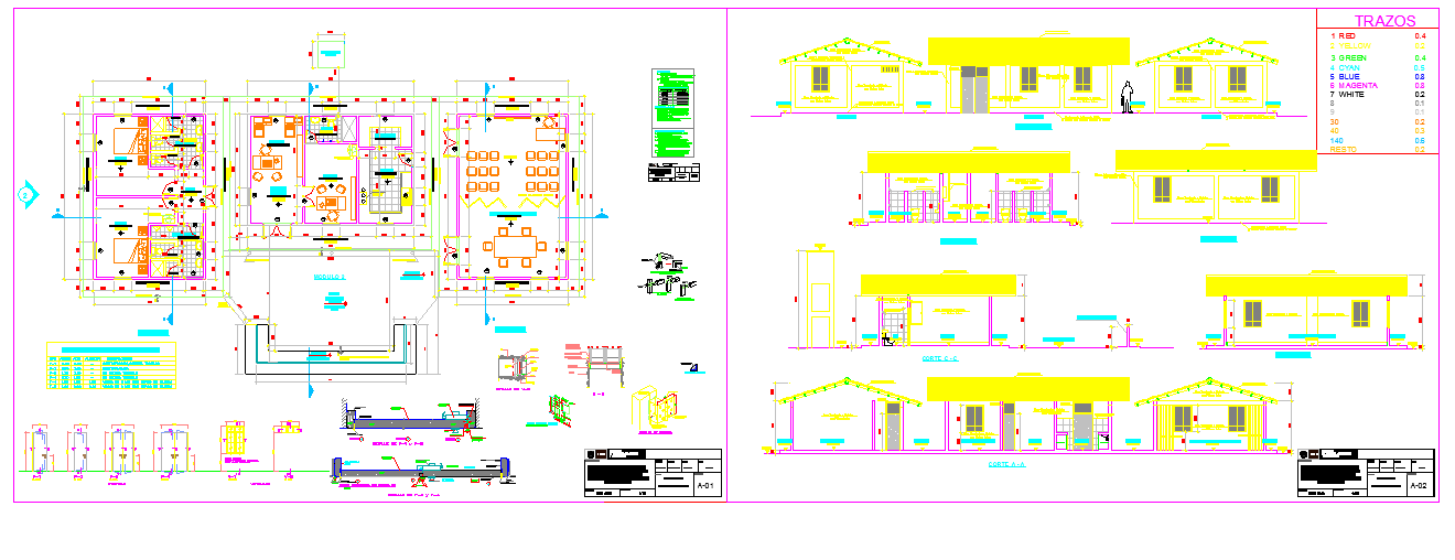 This school project design DWG provides detailed plans for a modern educational building. The drawing includes ground floor and first floor plans, section plans, and the primary block layout. Each area is designed for functionality, safety, and optimal space utilization, ensuring classrooms, administrative offices, and common areas are well organized.