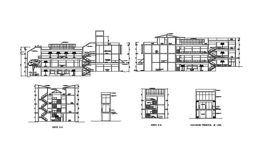 Commercial Building Elevation Section In DWG File which shows the details of door and window, floor level, elevation, section, lawn area, staircase details.