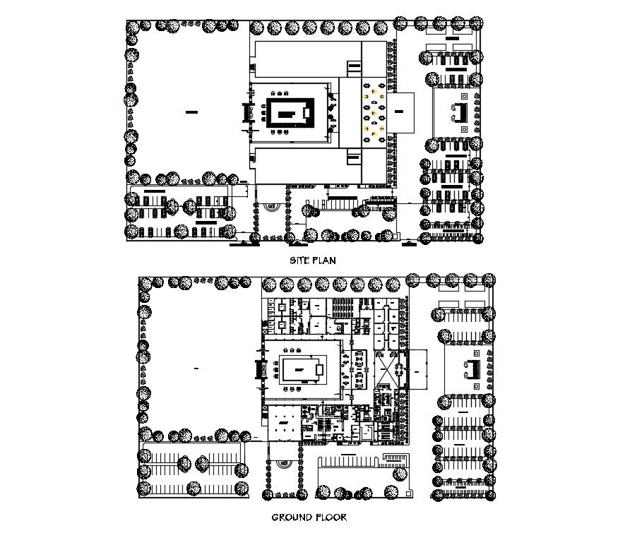 Hotel Plans In AutoCAD Drawings which includes the details of landscaping area, swimming pool, offices and admin area, coffee shop, floor plan details.