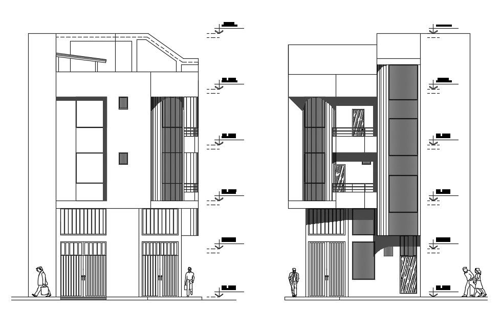 Download Free Hotel Elevation In DWG File which shows the elevation, floor level, window and door design, floor level details.