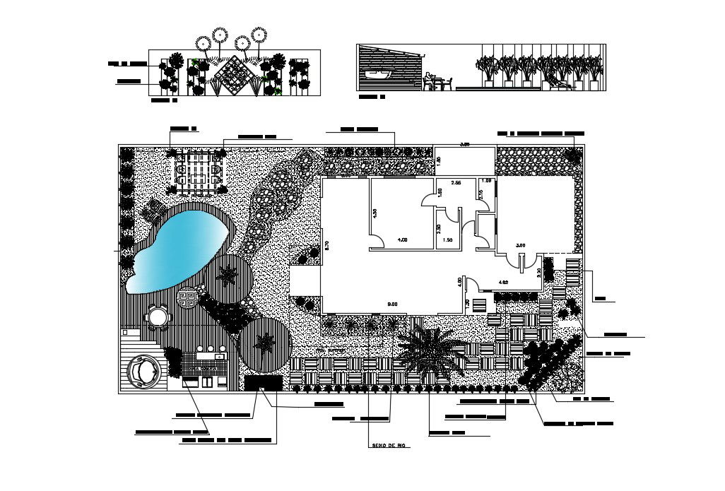 Bungalow Site Plan In AutoCAD Drawings which includes water body, plantation and paving area detail with dimensions, levels and description detail.