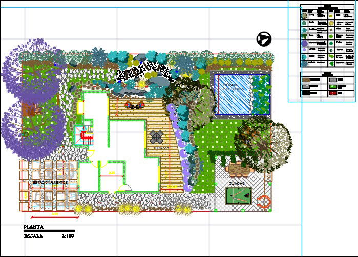 Landscaping plan of the home. Detail plan of landscaping detail with pergola, paving, pool, deck and flooring pattern outside of the house. Detail description of tree and other plantation like shrubs, etc.
