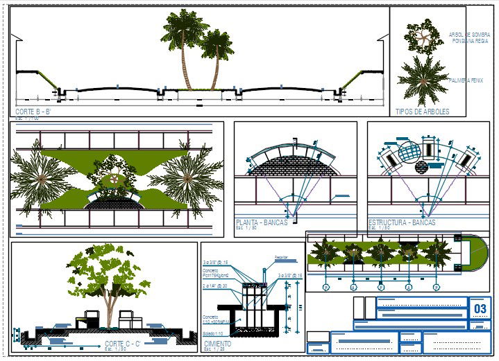 Landscape design in the central avenue. Drawing includes a plan with landscaping, different road section with detail. a section with blow up detail with dimension and labelling.