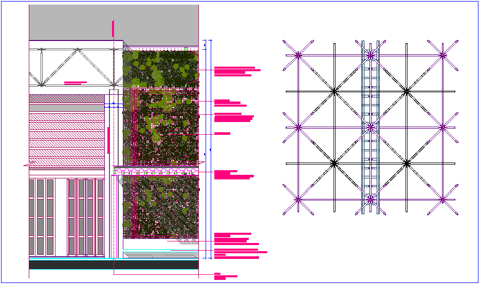 Green wall design structure design view dwg file in view with green grass and tree area view with structural support view with detail.