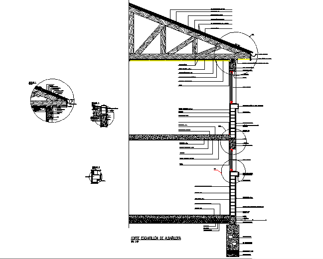 Template masonry detail dwg file, with naming detail, dimension detail, roof truss detail, window detail, etc.
