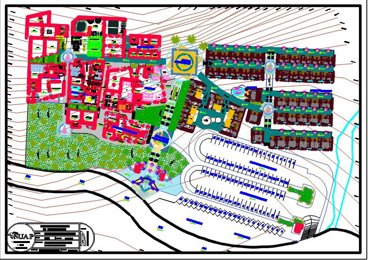 Tourist spa centre detail plan. Master layout of tourist spa centre with parking, contours, landscape design, parking, rooms and building organization as per different purpose.