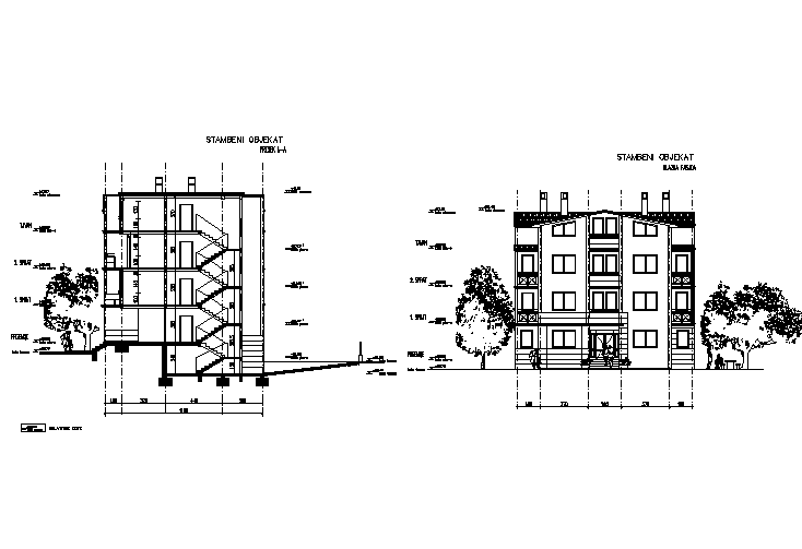 Elevation and section Multifamily detail dwg file, including dimension detail, naming detail, landscaping detail with both side tree detail, etc.