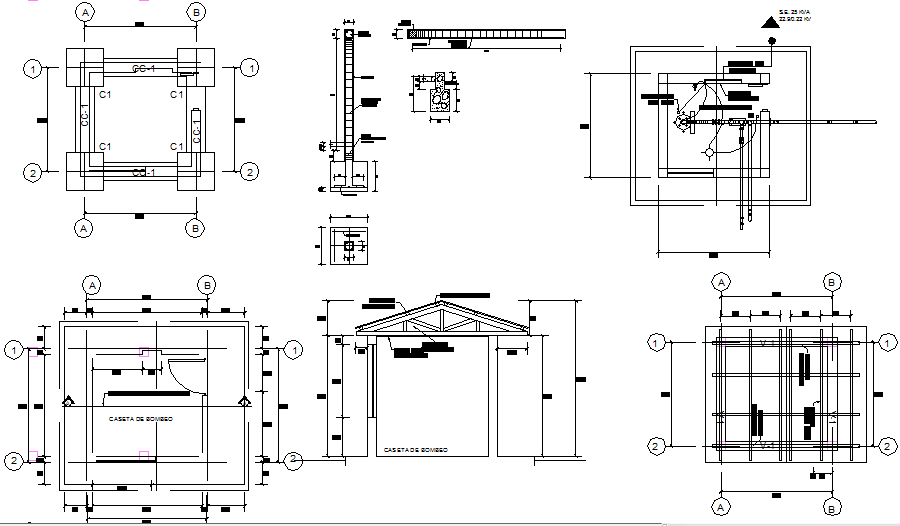 Foundation plan, elevation and section detail dwg file, including dimension detail, naming detail, centre line plan detail, roof truss detail, etc.