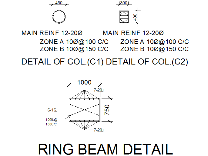 Ring beam detail dwg file, including reinforcement detail, dimension detail, naming detail, detail of circular column, detail of rectangle column, bolt nut detail, etc.