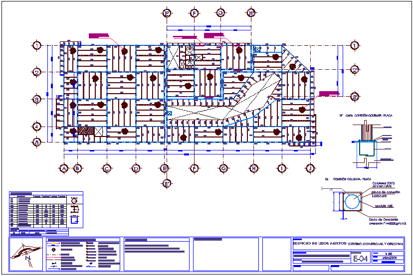 Ground floor structure plan with sectional detail view for shopping center and office dwg file