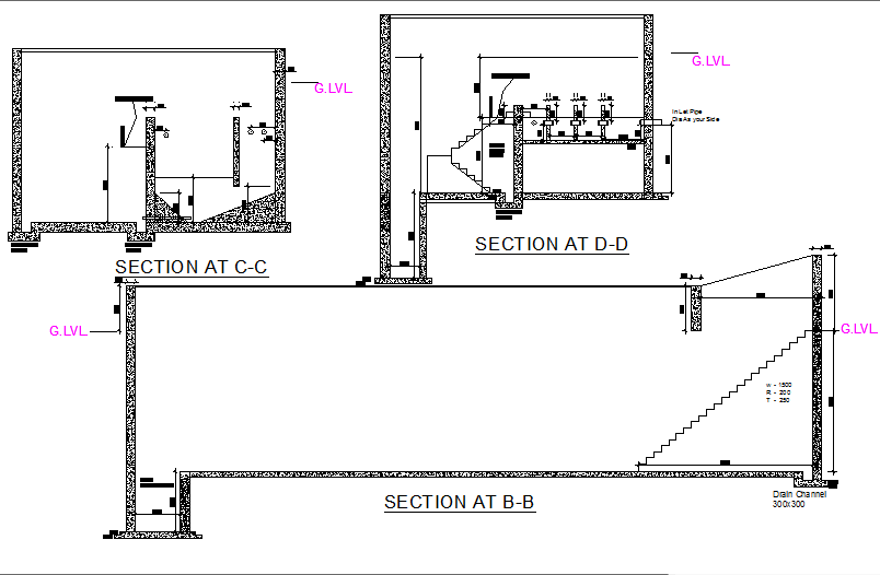 Section Sewage treatment plan detail dwg file, including section detail, dimension detail, naming detail, stair detail, section B-B’ detail, section C-C’ detail, section D-D’ detail, leveling detail, etc.
