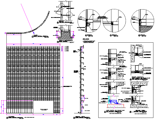 Curtain wall detail dwg file, including roof plan detail, section detail, dimension detail, naming detail, etc.