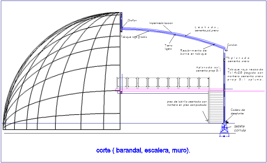 Geodesic gallery section vie with stair case and wall dwg file