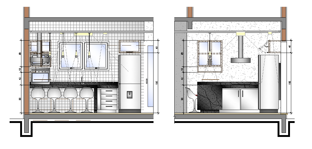 Modern kitchen design sectional elevation detail, furniture detailing of a kitchen is shown, table top with chairs etc