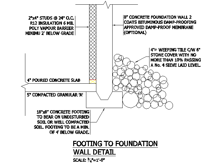 Footing to foundation wall detail dwg file, including naming detail, stone detail, scale 1’-00” detail, etc.