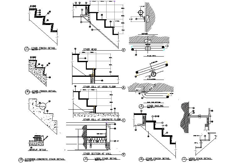Stair section dwg file, including centre line plan detail, riser and tread detail, dimension detail, naming detail, etc.