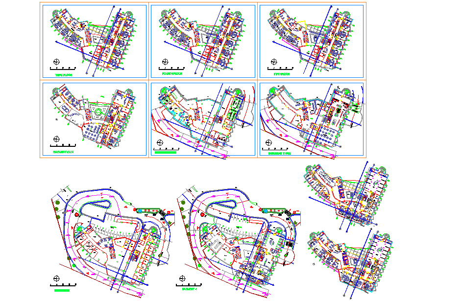 This hospital project DWG file showcases a complete architectural design layout prepared for a modern multi-level healthcare facility. The plan includes detailed representations of the basement, ground, and upper floors, with proper zoning for emergency wards, patient rooms, operating theatres, waiting areas, and administrative blocks. Each section has been carefully organized to ensure smooth internal circulation and effective use of available space. The design also highlights structural details, access points, service paths, and parking arrangements to enhance functionality and efficiency within the hospital premises.