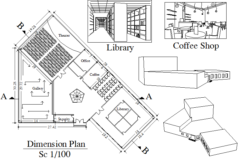 Layout theatre plan detail dwg file, with site plan detail, scale 1:300 detail, gallery 3 D view detail, front view detail, side view detail, etc.