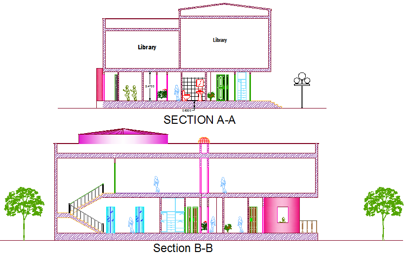 Section house detail dwg file, with section A-A’ detail, section B-B’ detail, street light detail, landscaping detail with both side tree detail, etc.